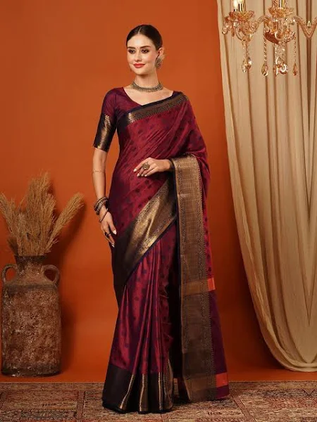 What sets Mysore Silk Sarees apart is their purity, as they are woven from 100% pure silk with authentic gold zari certified by the Silk Mark Organization of India. The designs are often minimal yet sophisticated, featuring floral motifs, geometric patterns, and traditional temple borders. The smooth, wrinkle-resistant fabric makes them a comfortable yet luxurious option for all-day wear. Whether styled traditionally or with a contemporary twist, Mysore Silk Sarees embody Karnataka’s rich textile legacy and remain an everlasting classic in every saree connoisseur’s collection.